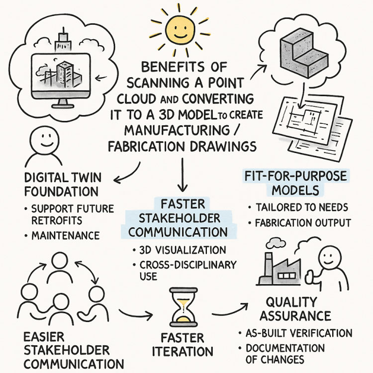 When you scan a physical space, component, or assembly using modern laser scanning or photogrammetry, you capture millions of data points — a digital twin of reality. Converting that data into a precise 3D model opens the door to benefits like: